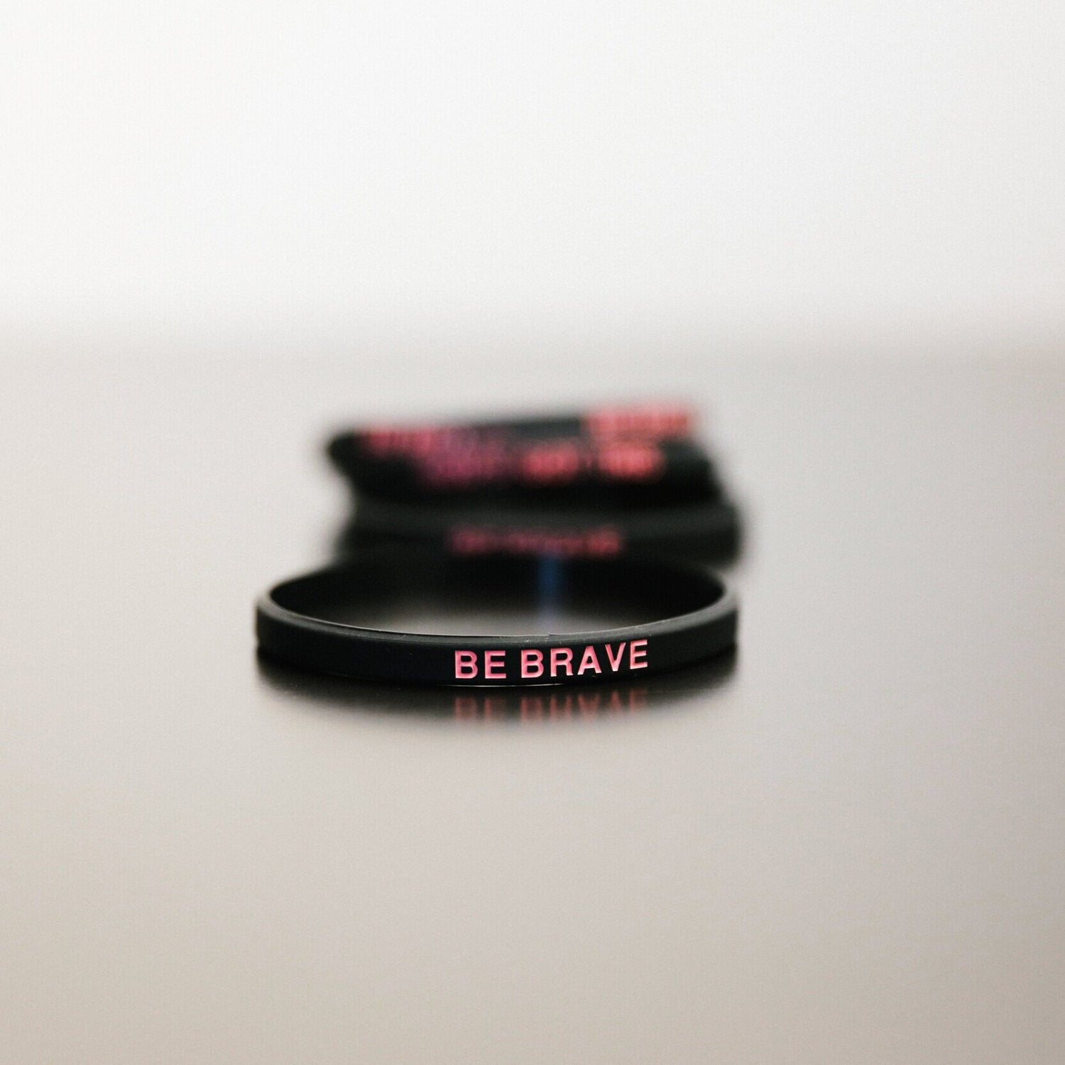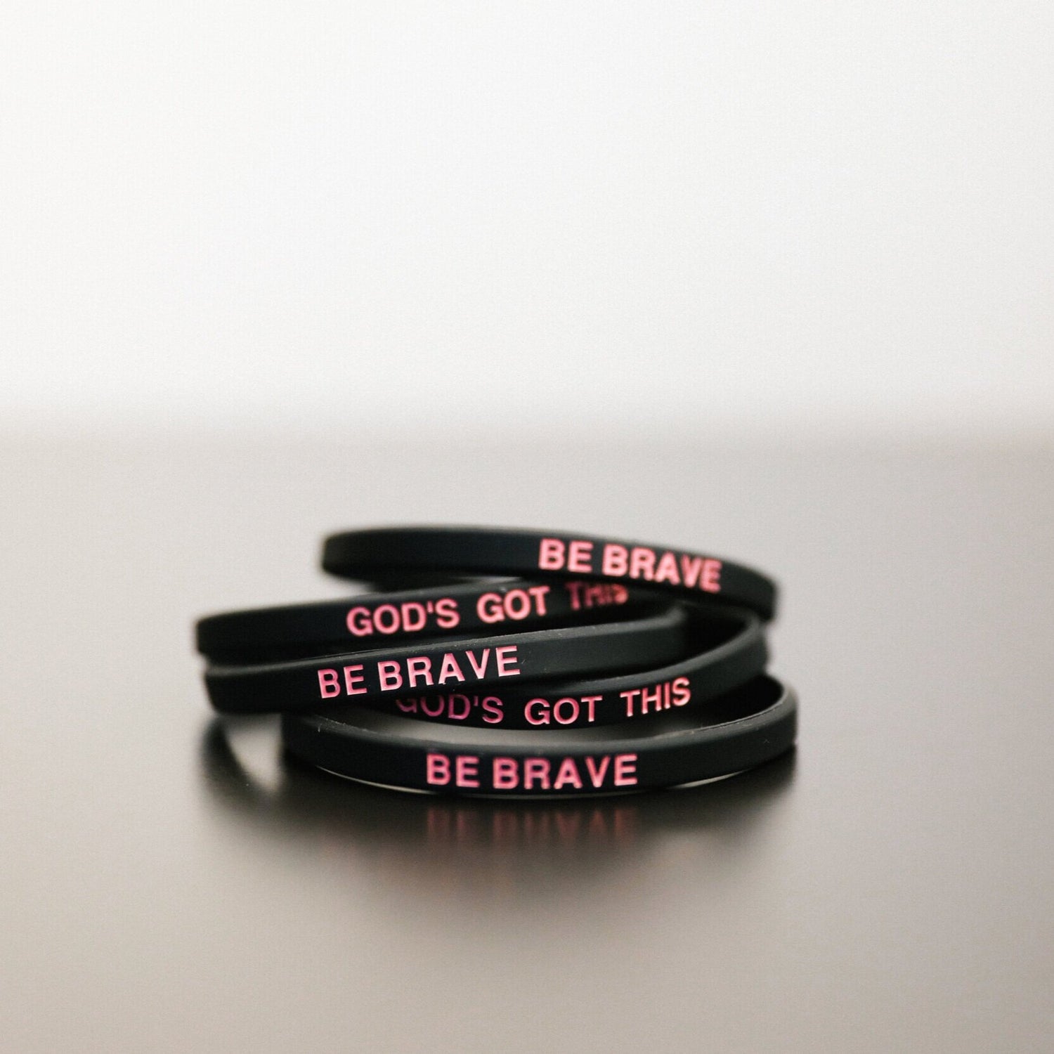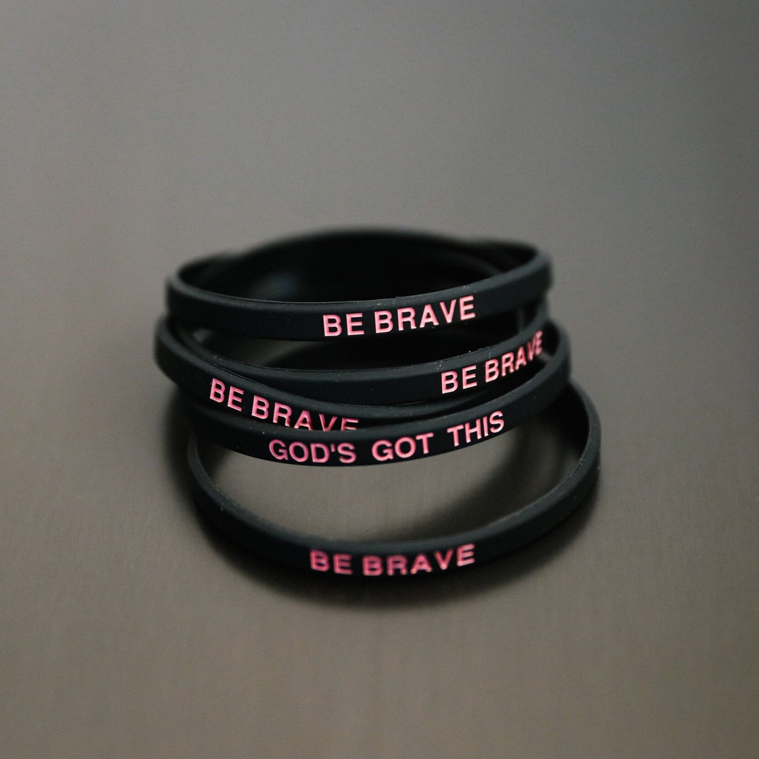 Thin black band with pink text: “Be Brave” on one side and “God’s Got This” on the other.