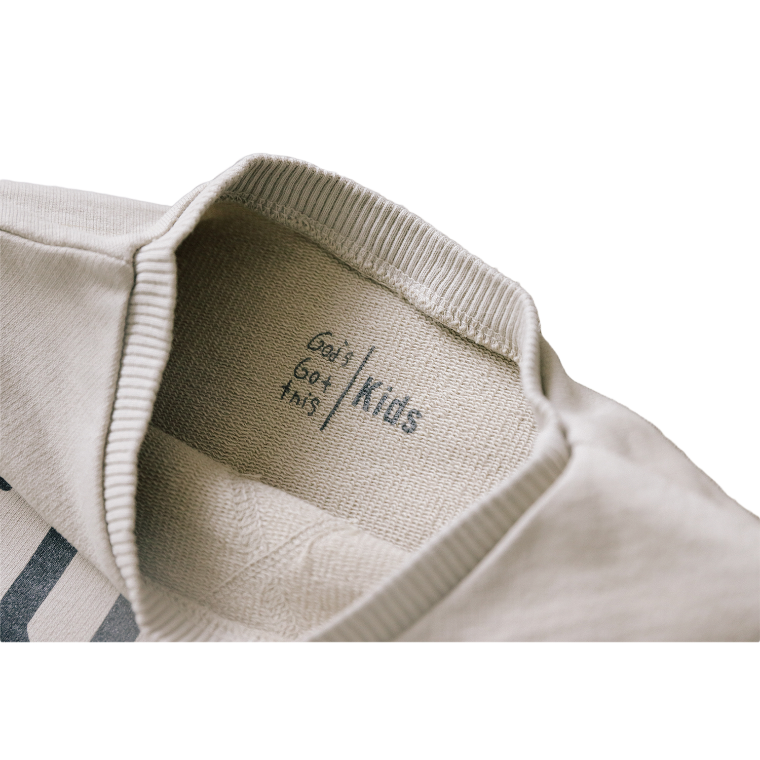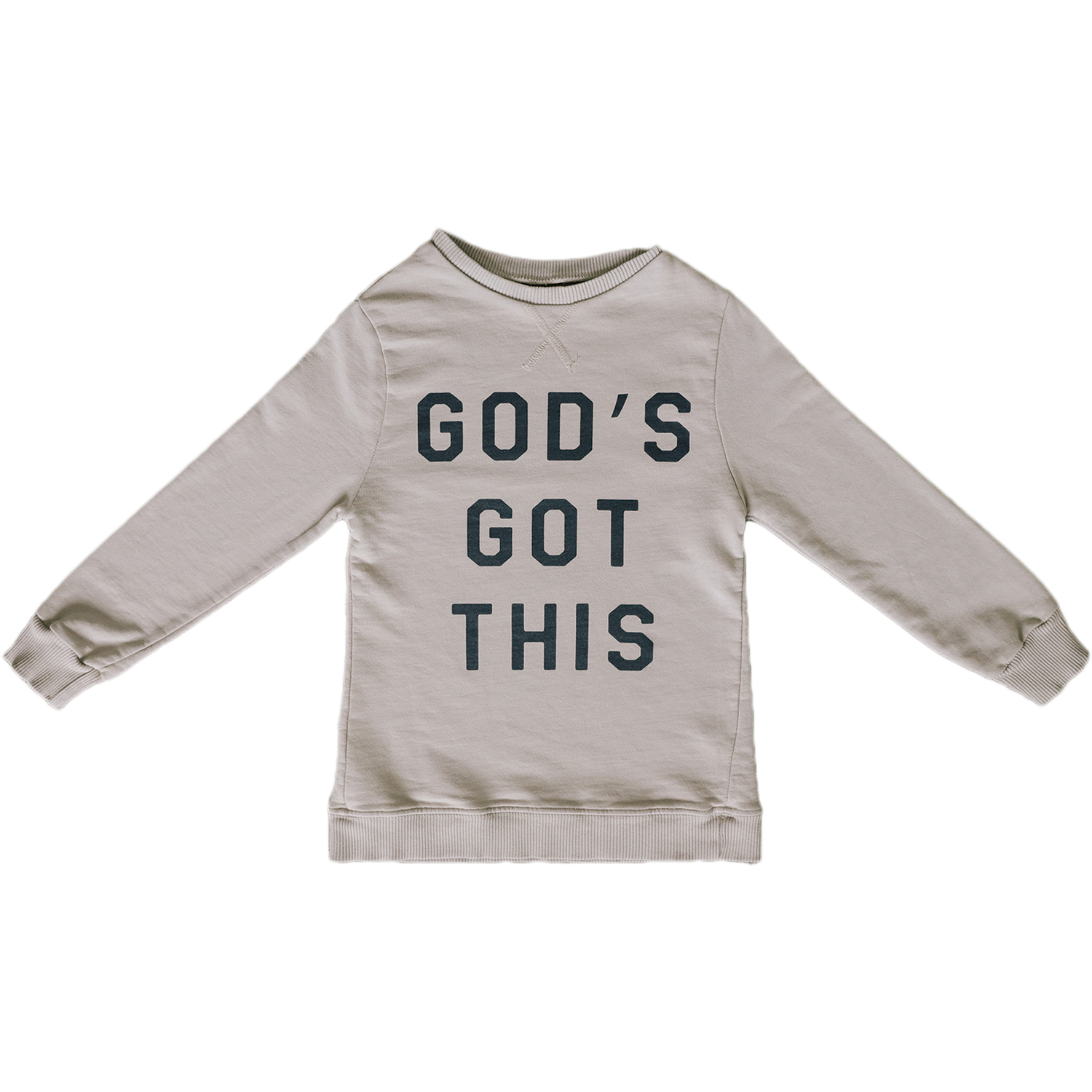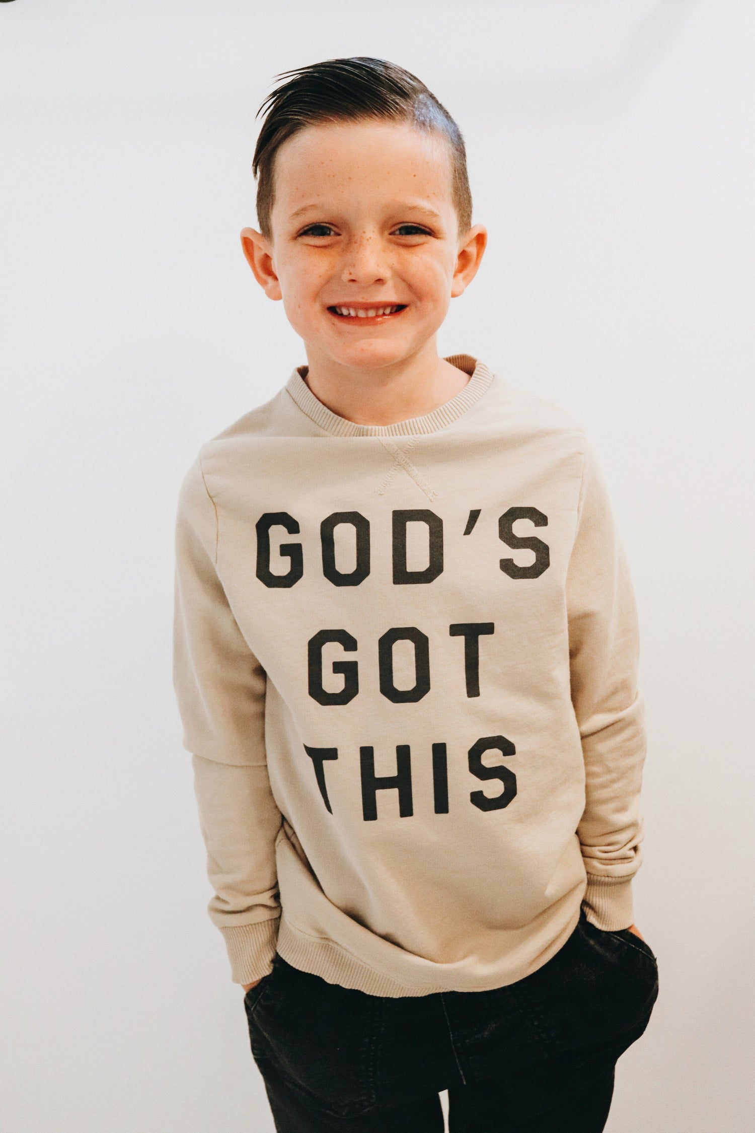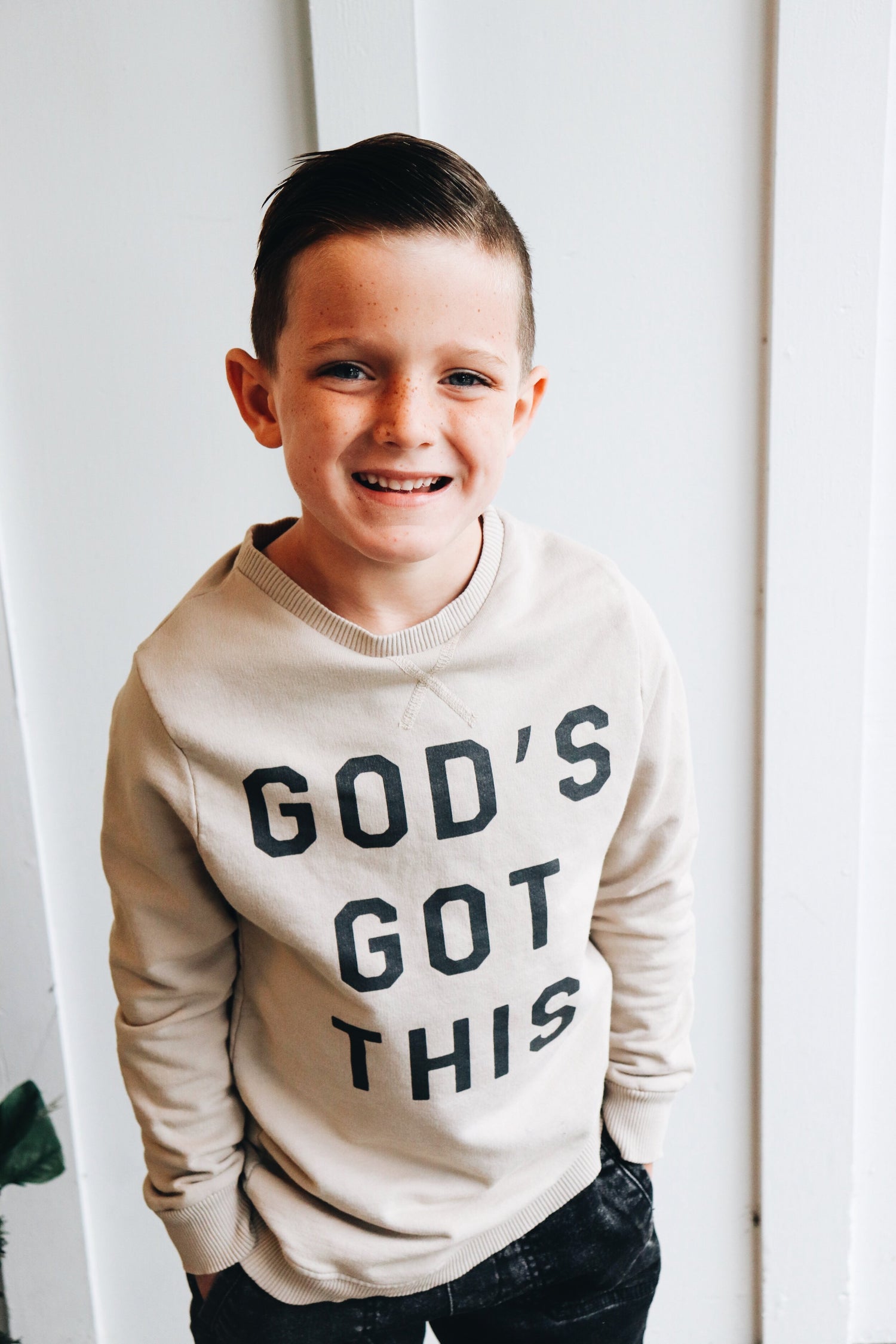 The Kid’s “God’s Got This” Sweatshirt is a unisex light/mid-weight sweatshirt that is cozy in every season. We like to call this color “Oatmeal”.